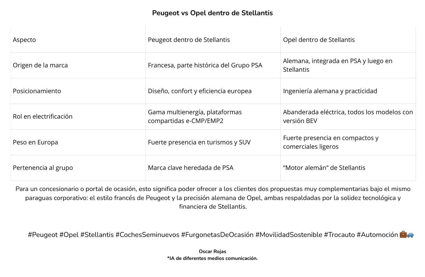 En el mercado de seminuevos y vehículos comerciales, Peugeot y Opel se benefician de gamas sólidas de turismos, SUV y furgonetas ligeras con versiones térmicas y eléctricas.